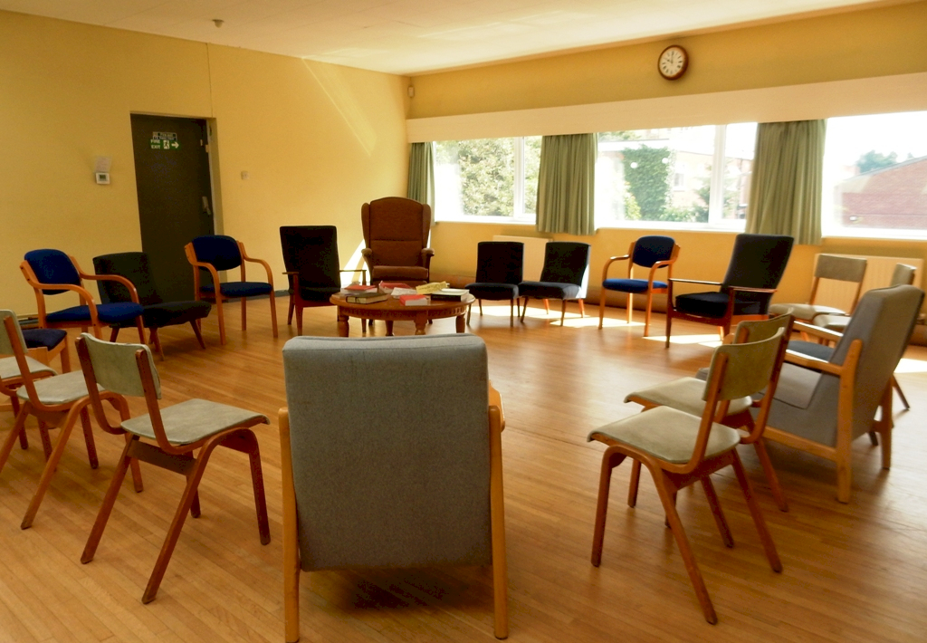 Our meeting room is simple, with chairs arranged in a circle. Sometimes there are only a few people present but on average there will be somewhere around 20 of us. In the centre there is a table with flowers and some books available to read that can be important to Quakers, including Quaker Faith & Practice and The Bible and some books for children. There is a wall-mounted screen where people may join the Meeting on Zoom – please talk to the doorkeeper if you would rather not be visible on Zoom.